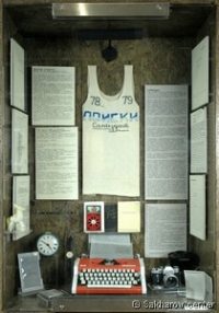 «Коллекции в прямом смысле у него нет — есть архив, но его не показывают. Музей состоит из стендов на одной стене, двух рядов стеллажей и одной сдвижной конструкции. На стендах коллажи из официальной жизни СССР, они заключены в большие стекла и выглядят очень хорошим оформлением школьного кабинета истории на тему “Этапы большого пути” — Ленин на трибуне, парады, физкультурники, ДнепроГЭС, война, космос, олимпиада. Напротив, на стеллаже — экспозиция “Репрессии в СССР” — красный террор, Соловки, раскулачивание, Беломорканал, ежовщина, военные репрессии, борьба с комполитизмом, ХХ съезд. Между рядами стеллажей — частная история. Слева — жизнь в ГУЛАГе, фотографии из личных дел, приговоры, справки о реабилитации, справки об освобождении, письма, ватники, орудия труда, посуда. Справа — история сопротивления в СССР, подпольные организации, церковь, диссидентское движение, “Хроника текущих событий”, фотокопии “Архипелага ГУЛАГ”, диссидентская кухня, искусство андерграунда, приемники для вражьих голосов и пластинки “Битлз”. На сдвижной конструкции — биография Сахарова в картинках. Если сдвинуть — получается зал для заседаний и кинопросмотра.