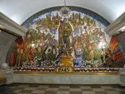 The ensemble comprises a museum, a park, where a Russian Orthodox church, a mosque and a synagogue were constructed, alleys, victors’ squares and fountains in front of the museum. A similarly named metro station specially constructed to mark the 60th anniversary of the victory in war is ideologically and artistically connected with the memorial. It’s here that the greater part of visitors start their way to the memorial, and the designers of the modern station used the principles of Stalinist architecture in its organization, included mosaics with the images of the soldier from the Berlin’s Treptower Park, reminded of the connection between the Poklonnaya gora and the memory of the 1812 Patriotic War – the symbolism in the design of the station is extremely loaded, concentrated, it prepares for a visit to the memorial itself.