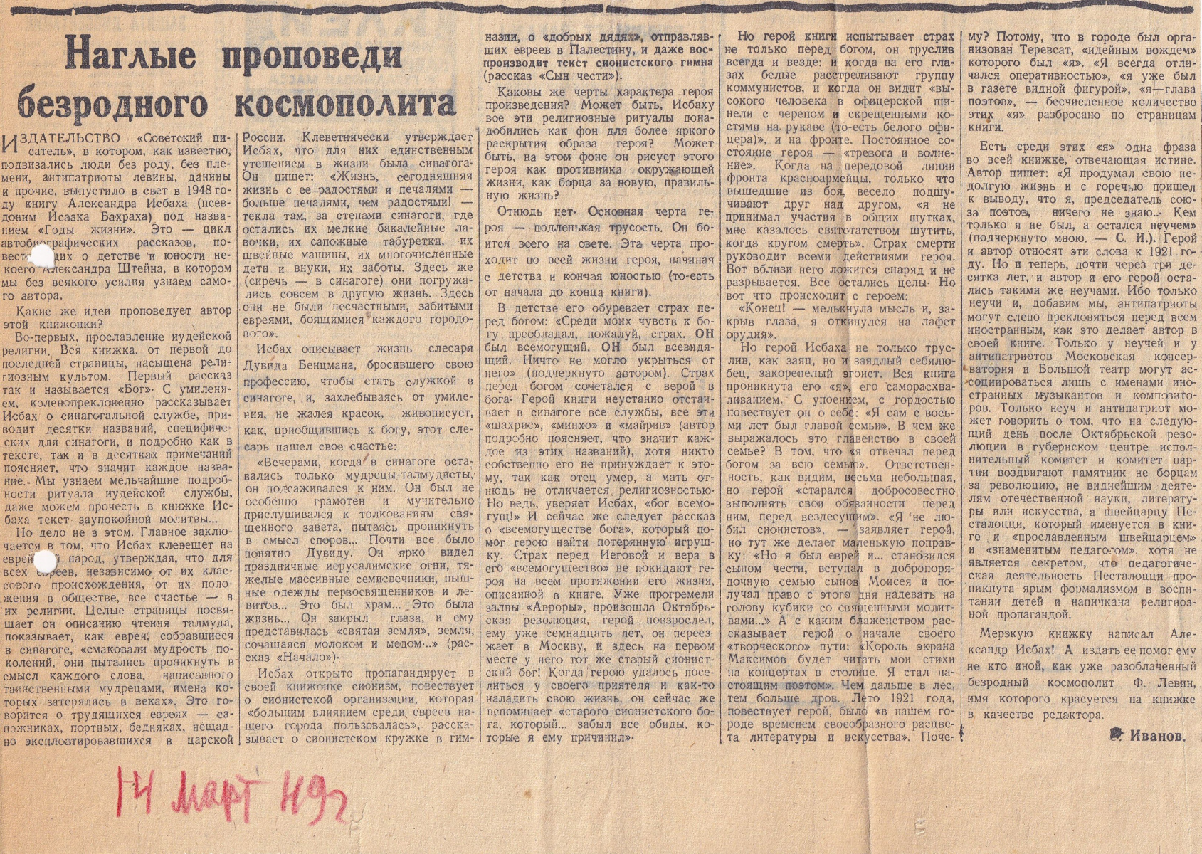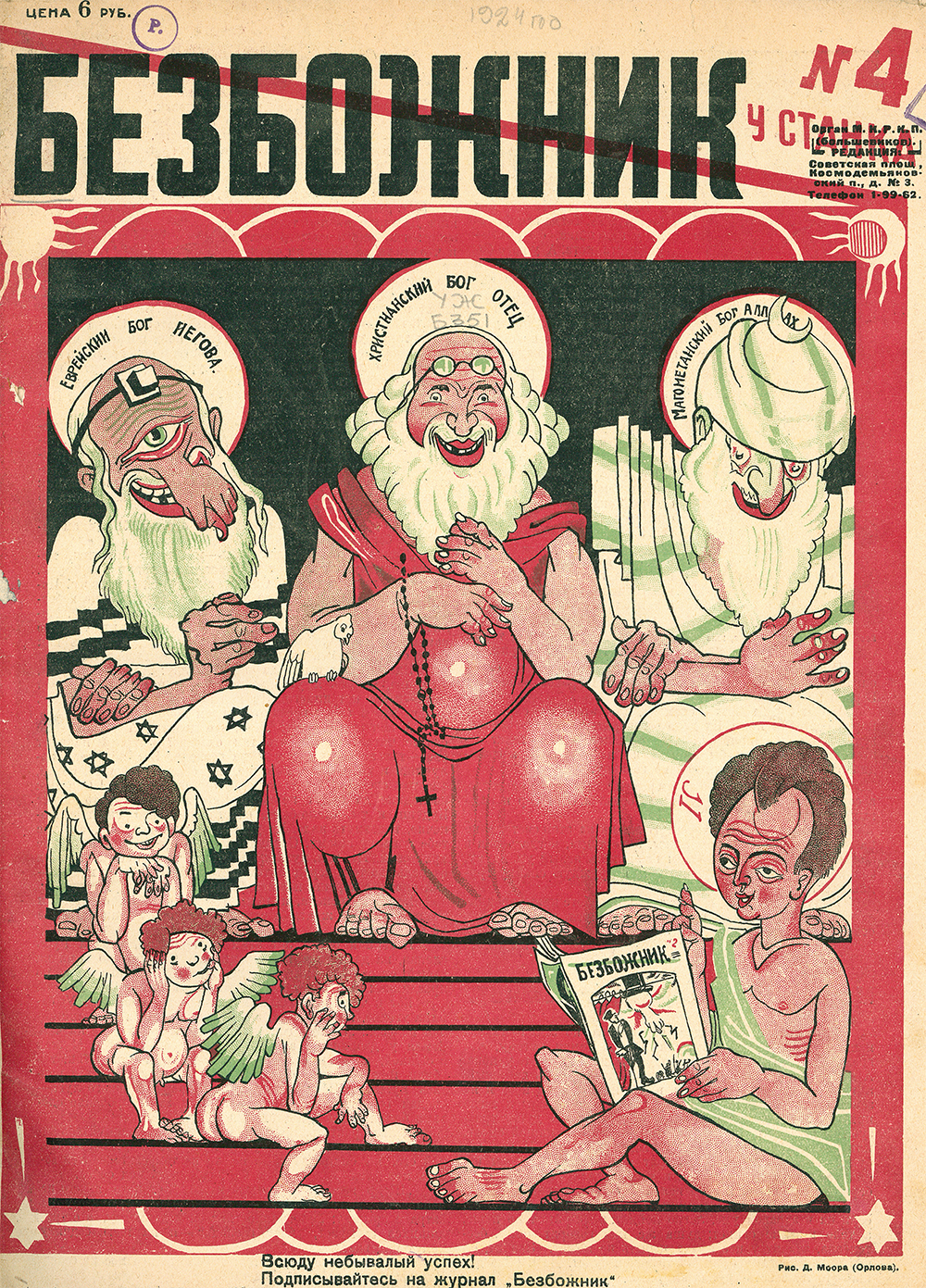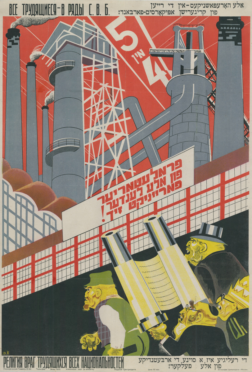 Рядом с материалами, отражающими культурные и социально-экономические аспекты жизни советских евреев — еще одна реальность 1920-х–30-х гг. — агрессивная антирелигиозная пропаганда, в данном случае направленная против иудаизма. Объекты «шельмования» на страницах журналов «Безбожник» и «Безбожник у станка» — раввины, учителя иешив, хасиды и даже… сионисты, никакого отношения к религиозной жизни евреев не имевшие. Здесь отчетливо виден важный нюанс антииудейской/антираввинской пропаганды — в большинстве карикатур, изображающих служителей культа и адептов веры (и здесь же сионистов), издевательски утрированы еврейские «физиогномические особенности». В этой же части экспозиции представлены публикации, иллюстрирующие кампанию по борьбе с антисемитизмом, развернувшуюся на страницах советской печати в 1928–29 годы. Эти публикации (особенно первая страница «Пионерской правды» от 28 февраля 1929 г.) ярко свидетельствуют о многочисленных и повсеместных проявлениях бытового антисемитизма. Вероятно, рост антисемитизма был, в том числе, реакцией на первую известную нам попытку Сталина разыграть антисемитскую карту в ходе борьбы с левой оппозицией. Партийные и комсомольские собрания, на которых клеймились сторонники Троцкого, особенно на местах, нередко приобретали антисемитский характер (эксплуатировалось то, что среди сторонников оппозиции выделялись люди с еврейскими фамилиями, или люди носившие псевдонимы, за которыми «скрывались» еврейские фамилии). Сталин был убежден, что русский человек не будет поддерживать Троцкого, Каменева и Зиновьева. Но, по всей видимости, выпущенный из бутылки джин был сочтен партийным руководством неуместным, преждевременным. Правда, уже в 1930-е годы борьба с антисемитизмом стала носить редкий, эпизодический характер.