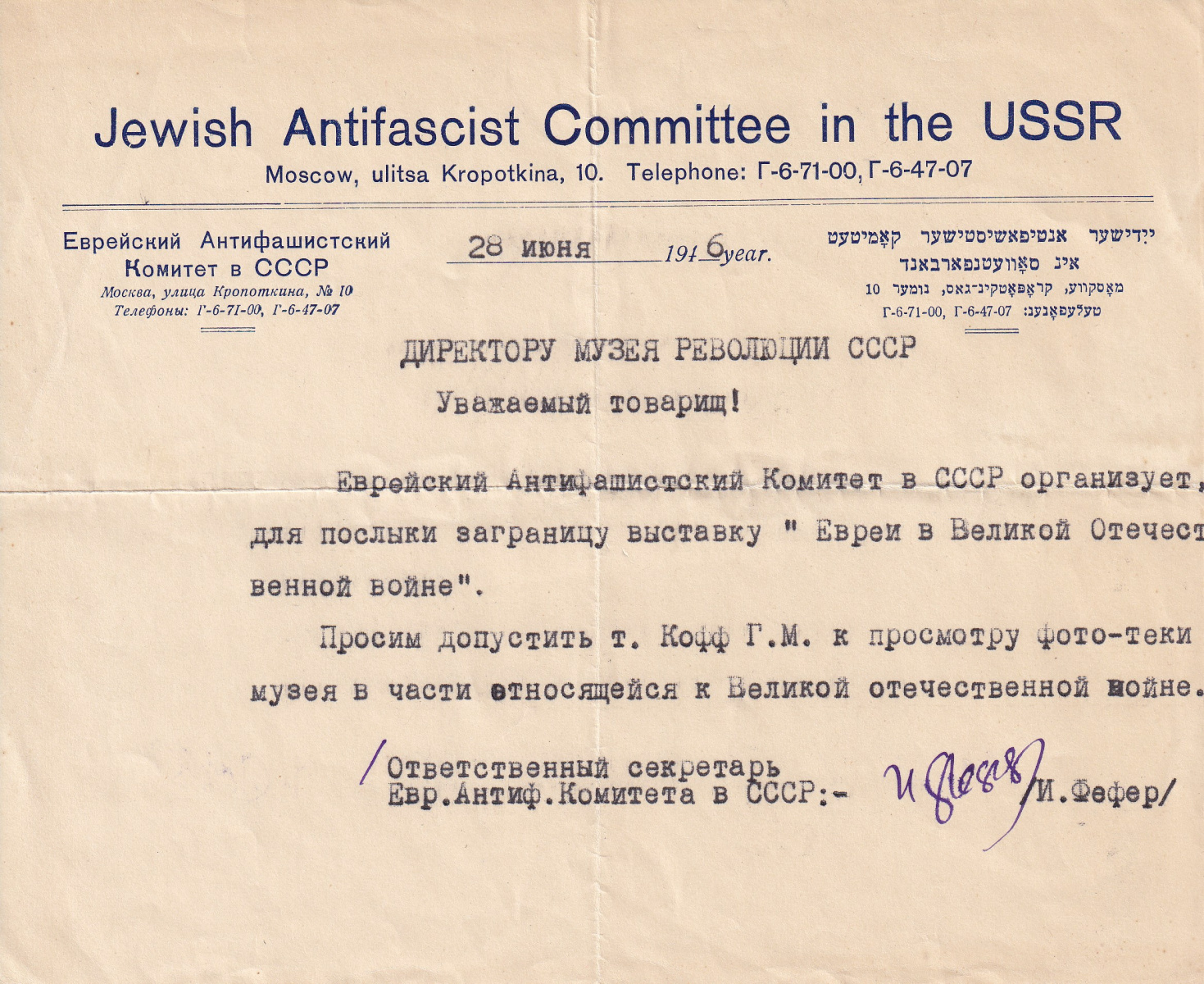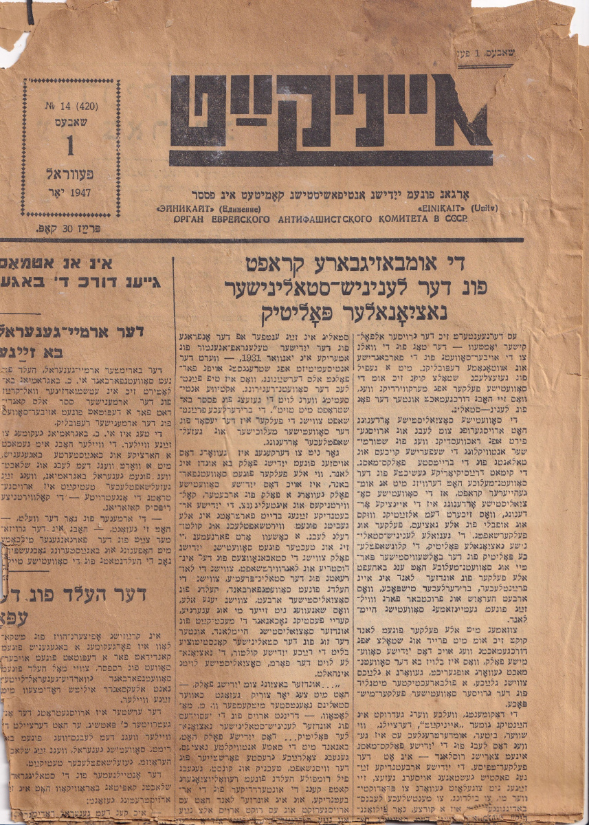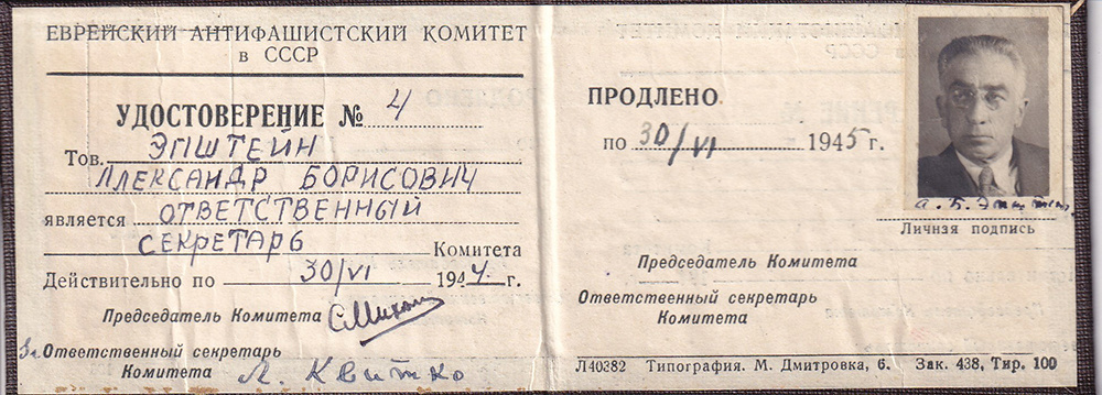 Об общественной деятельности советских евреев в годы Великой отечественной войны, о работе Еврейского Антифашистского Комитета рассказывают уникальные документы из архива «Мемориала». Речь идет, в том числе, о малоизвестном эпизоде из деятельности ЕАК — подготовке в 1944–1946 гг. выставки (так и не состоявшейся) «Евреи в Великой отечественной войне». Полагаем, выставка (в экспозиции можно увидеть машинописный экземпляр «Списка евреев — Героев Советского союза» и справки из Наркомата обороны о количестве награжденных по национальностям) — должна была стать своеобразным ответом на принявший в тылу угрожающие размеры бытовой антисемитизм: известна распространенная антисемитская шутка того времени, что евреи воюют исключительно на «ташкентском фронте». Несколько подлинных фотографий и документов связаны с жизнью и деятельностью Шахно (Александра) Эпштейна (1889–1945), одного из руководителей ЕАК. Сохранился уникальный документ — удостоверение ЕАК, выданное «Ответственному секретарю Александру Эпштейну», подписанное С. Михоэлсом и Л. Квитко. Здесь же освещается история публикации знаменитой «Черной книги», составленной при активном участии И.Г. Эренбурга и В. Гроссмана, и запрет на ее публикацию в 1947 году.