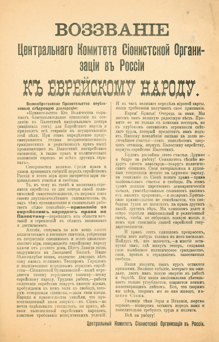 Начинается пролог с Февральской революции и заканчивается победой большевиков в Гражданской войне. Несколько экспонатов отражают важнейшие для российских евреев вехи. Постановление Временного правительства от 20 марта об отмене вероисповедных и национальных ограничений (газета «Вестник Временного правительства» от 22 марта 1917 г.) снимает с евреев — самого ущемленного народа Российской империи — все ограничения. Принятие «Декларации Бальфура» (плакат на русском языке, выпущенный «Центральным комитетом сионистской организации в России» в ноябре 1917 г.) — открывает перед евреями перспективы построения своего государства в Палестине.