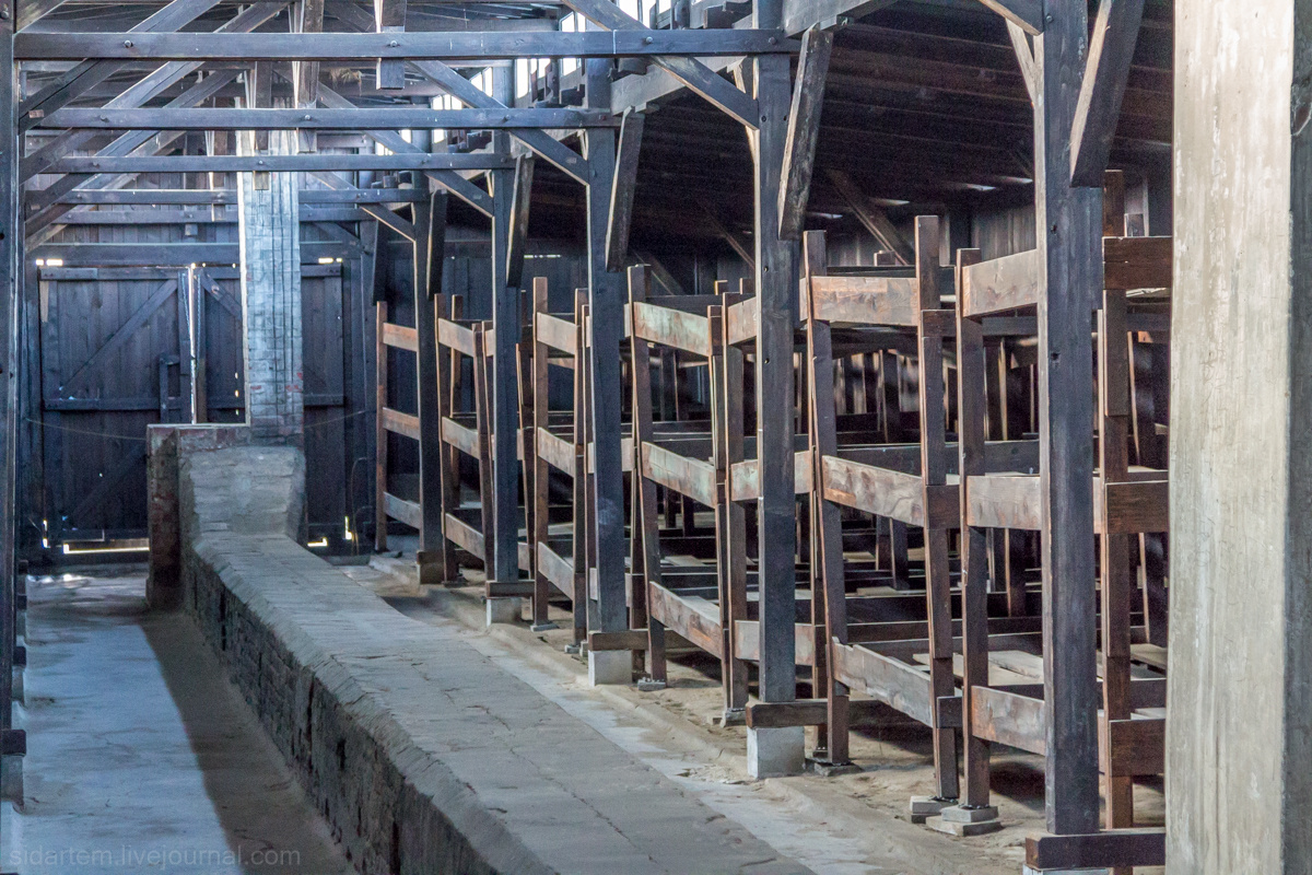 Заключённые другой части лагеря, Биркенау, размещались в кирпичных или деревянных бараках. Кирпичные бараки стояли в более старой части лагеря, известной как БI, в кторой строительство началось осенью 1941-го. Внутри каждого кирпичного барака было 60 трёхъярусных секций, всего – 180 спальных мест, каждое из которых было рассчитано на 4-х заключённых. Таким образом, СС предполагало, что в одном бараке будет вмещаться около 700 заключённых. Изначально полы в бараках были земляными, позже они были застланы плоским кирпичом или цементными плитками. Зимой бараки не отапливались. Двух металлических буржуек, которые всё-таки установили, не хватало для прогрева всего помещения. Не было и санитарных удобств. Только в 1944-м году раковины и туалеты были установлены в по углам всех блоков. Электрического освещения в начале тоже не было.